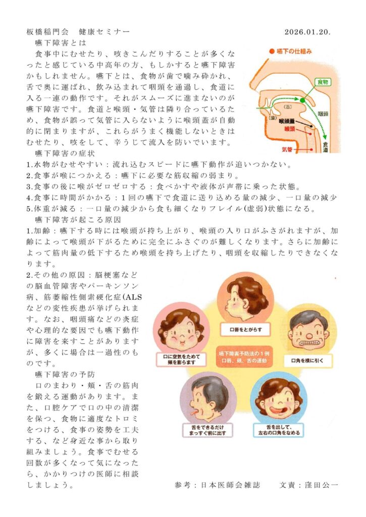 食事中にむせたり、咳きこんだりすることが多くなったと感じている中高年の方、もしかすると嚥下障害かもしれません。嚥下とは、食物が歯で噛み砕かれ、舌で奥に運ばれ、飲み込まれて咽頭を通過し、食道に入る一連の動作です。それがスムーズに進まないのが嚥下障害です。食道と喉頭・気管は隣り合っているため、食物が誤って気管に入らないように喉頭蓋が自動的に閉まりますが、これらがうまく機能しないときは、むせたり、咳をして、辛うじて流入を防いでいます。