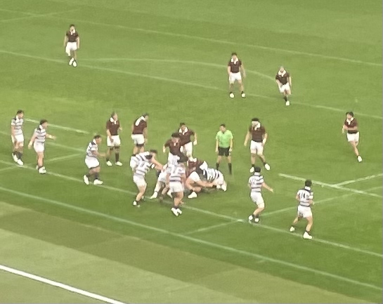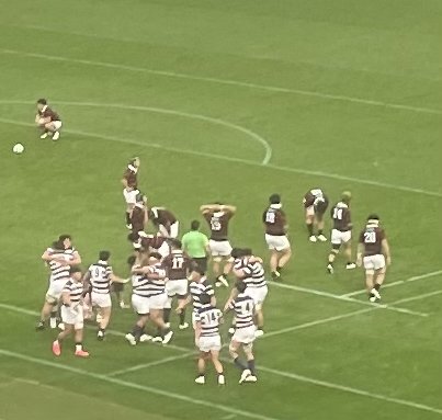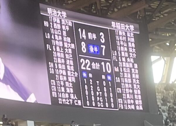 試合は終始明治ペース。早稲田は準決勝の帝京戦で成功したコンテストキックに拘り、持ち味の展開ラグビーは影をひそめたまま。おまけに、コンテストキックキャッチの際の危険なプレーにより、矢崎がシンビンで10分間の退場処分に。一方、明治はコンテストキックのほとんどを制しカウンターアタックを仕掛け、早稲田のお株を奪うような展開ラグビーで次々とラインブレイクを重ねていきました。明治が2トライ2ゴールの14点、早稲田が1PGの3点で前半が終了。後半も赤黒ジャージではなく紫白ジャージがフィールド内を自在に動き回ります。早稲田は相変わらずコンテストキック一辺倒。ここぞという場面でのノックフォワードも重なり、本来の展開ラグビーに切り替えた73分過ぎまで明治陣22メートル内でアタックをすることができない始末。70分過ぎにようやく初トライを奪えたものの22対10で完敗、「対抗戦3位のチームは選手権で優勝できない」というジンクスを破ることができませんでした。