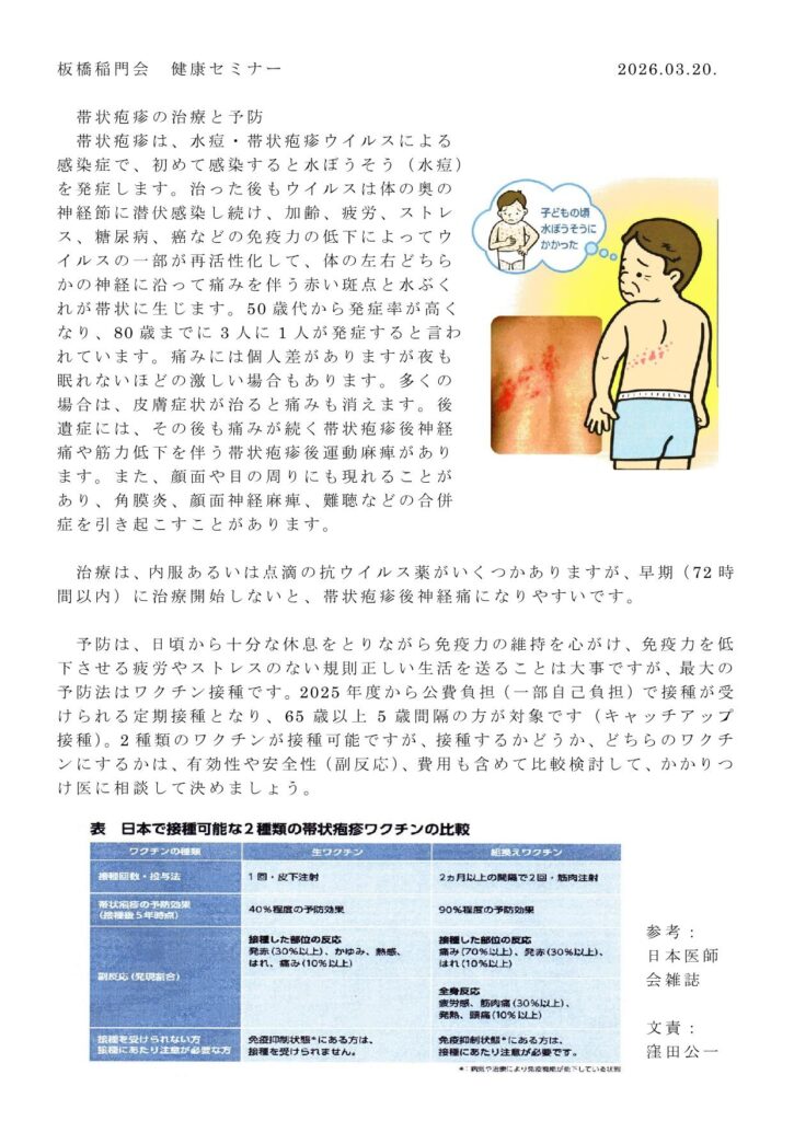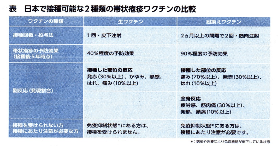 予防は、日頃から十分な休息をとりながら免疫力の維持を心がけ、免疫力を低下させる疲労やストレスのない規則正しい生活を送ることは大事ですが、最大の予防法はワクチン接種です。2025年度から公費負担(一部自己負担)で接種が受けられる定期接種となり、65歳以上5歳間隔の方が対象です(キャッチアップ接種)。2種類のワクチンが接種可能ですが、接種するかどうか、どちらのワクチンにするかは、有効性や安全性(副反応)、費用も含めて比較検討して、かかりつけ医に相談して決めましょう。